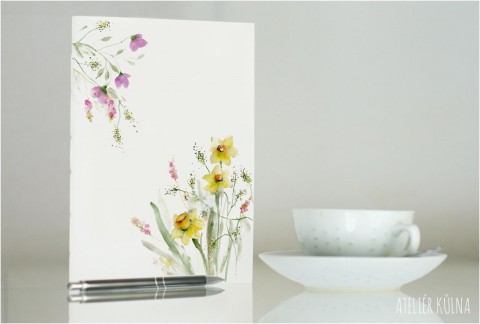 14 hladkých béžových případně bílých listů, vnější obal pevný papír, hladký bílý, vlastní autorský obrázek na vnější straně.
