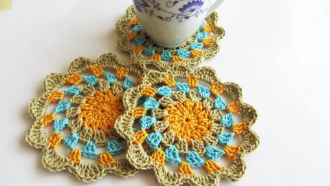 Háčkovaná podkafíčka z bavlněné a bambusové příze. Velikost prostírání je 12 cm.
