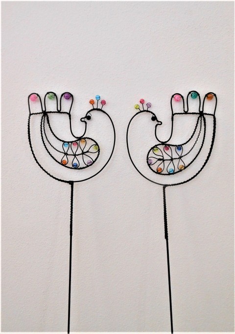 Zápich je vyroben ze žíhaného drátu, který je dozdoben skleněnými a plastovými korálky. Velikost ptáčka je cca 12x12cm, délka celého zápichu je cca37cm. Zápich můžete použít nejen do květináčů, ale i do suchých vazeb. Cena za kus.