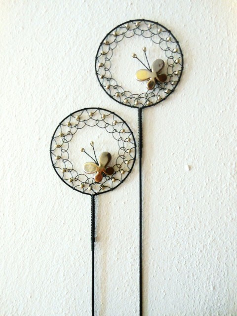 Zápich je vyroben ze žíhaného drátu, který je dozdoben skleněnými korálky a motýlem. Průměr kolečka je 8 cm, délka celého zápichu je cca35cm. Zápich můžete použít nejen do květináčů, ale i do suchých vazeb. Cena za kus.