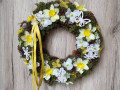 Krásný jarní věnec ve žlutozeleném ladění k zavěšení na stěnu nebo na dveře, střední velikosti. Je bohatě zdobený různými druhy suchých plodů, stabilizovaným mechem, látkovými květy narcisů a dalšími přízdobami.