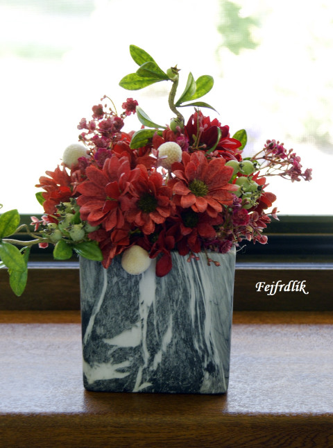 Originální celoroční dekorace s umělými a látkovými květinami, bobulemi a sušenou kraspedií v keramickém obalu mramorového vzhledu ve tvaru kostky.