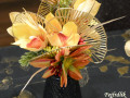 Originální kytička uvázaná z umělých květin cymbidií a klematisu, bobulek a pozlacených větví jinanu a trávy. Vel. na délku 35 cm/ šířka cca 24 cm. BEZ VÁZIČKY.