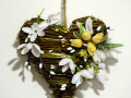 Přírodní proutěné srdíčko o velikosti 21cm/18 cm s očkem na zavěšení kamkoliv s umělými sněženkami a tulipánky.
