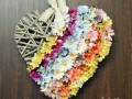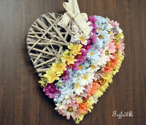 Krásné velké šedobílé proutěné srdce s umělými a látkovými kopretinami různých barev. Doplněno umělými drobnými lučními kvítky a korálky.