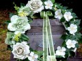Bílý proutěný věnec s pivoňkou, růžemi a kvítky a bobulemi v zelených odstínech.
