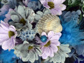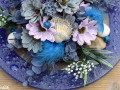 Originální aranžmá na skleněném (skloplast) talíři s látkovými květinami , umělým eukalyptem, bobulkami , peříčky a ulitkami...