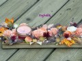 Na dřevěném tácu jsou umělé květiny, listy a vřes, umělý skočec a svíčka ve skle ( bez vůně). Délka 46 cm i s aranží/ výška 9 cm a šířka cca 22 cm.