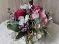 Květinové aranžmá z kvalitních látkových květin, růží, pivoněk, krásenek a hortenzie v bílé keramické misce doplněné přírodní tilandsií a látkovou a umělou zelení. Dekorace je trvanlivá a je vhodná jako krásný romantický dárek.