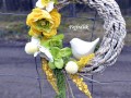 Nejen jarní věneček o průměru 26 cm s očkem na zavěšení, s keramickým ptáčkem a umělými květinami, pěnovými bambulkami.