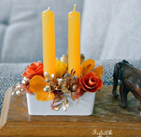 Originální podzimní/zimní svícen se dvěmi oranžovými svíčkami , látkovými listy jinanu, dřevěnými růžičkami (oranž se zlatými třpitkami), zlatou bazalkou a lišejníkem v bílé lesklé žardince .