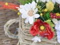 V proutěném trakaři jsou látkové a umělé květiny a sušina ( obilí, ječmen, len. ). Velikost na výšku je cca 30 cm, šířku 28 cm, délka 33 cm a i s aranží 36 cm.