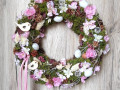 Krásný romantický věnec do růžového ladění k zavěšení na stěnu nebo na dveře, střední velikosti. Je bohatě zdobený různými druhy suchých plodů, dovozovým stabilizovaným trvanlivým mechem, látkovými květy a dalšími přízdobami.