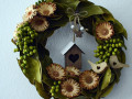 Přírodní věneček s exotickými sušenými listy,, Quiny ,,a květy Protey compacta rosette s dřevěnými ptáčky a budkou.
