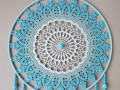 Základní kovový kruh má průměr 40 cm a je omotán 100% bavlnou. Je vyplněn ručně háčkovanou krajkou z velmi kvalitní příze 50% bavlna a 50% polyakryl od českého výrobce. Tato příze je postupně stínovaná s dlouhými barevnými přechody a barva postupuje od středu od nejsvětlejší modré až po modrou na okrajích. Na kruhu je na dřevěných a plastových korálcích zavěšeno tyrkysově modré pštrosí peří.