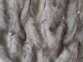 Základní kovový kruh má průměr 40 cm. Je omotán šedou 100% bavlnou a je vyplněn ručně háčkovanou krajkou z velmi kvalitní příze 50% bavlna a 50% polyakryl od českého výrobce. Tato příze je postupně stínovaná s dlouhými barevnými přechody a barva postupuje od středu od šedé až po tmavou šedobéžovou na okrajích. Na kruhu je na dřevěných korálcích a voskových perlách zavěšeno tmavě šedé pštrosí peří.