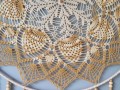 Základní kovový kruh má průměr 50 cm. Kruh je omotán béžovou bavlnou. Háčkovná vnitřní krajka je nakombinovaná v béžové, žíhané a hořčicové barvě. Je háčkována ze 100 % bavlny. Na kruhu je na dřevěných korálcích zavěšeno béžové pštrosí peří.