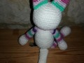 Kočička je uháčkovaná krátkými sloupky a vyplněná umělou střiží. Vysoká je cca 30cm. Nohy, ruce a uši má pruhované. Na přání může být jednobarevná nebo v jiné barevné kombinaci. Může se prát, raději ručně.