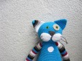 Háčkovaný kocúr Leo v tyrkysovo modrej farbe s farebnými rúčkami a nožičkami, vyrástol do dĺžky cca 36 cm, bezpečnostné oči zelené, mačacie, materiál 100% bavlna, vyplnený polyesterovým vláknom.