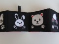 Černobílé leporelo s motivy zvířátek udělá radost vašim dětičkám a zabaví je na chvíle vašeho odpočinku. Leporelo je ušité z bavlněné látky s atestem pro děti do tří let věku dítěte. Přední strana je zpevněna vlizelínem, zadní strana je bavlněná látka v barvě červené a bílé. Leporelo je vyplněno je termolínem. Leporelo má všité stužky na kterých si dětičky cvičí jemnou motoriku. Velikost leporela je 62 x 10 cm. Leporelo můžete vložit do ušitého pytličku.