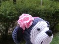 Háčkovaná opička Sisinka v pestrých farbách s ružovou kytičkou na hlavičke, 100% bavlna, čierne bezpečnostné oči, vyplnená polyesterovým vláknom. Doplnok je gombík v tvare srdiečka. Farba gombíka sa može líšiť podľa dostupnosti.