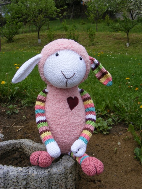 Háčkovaná ovečka Ibi vo farbe starorúžovej, vyrástla do výšky cca 40 cm. Materiál 100% bavlna a 100% polyester. Vyplnená antialergickým polyesterovým vláknom. Čierne bezpečnostné oči.