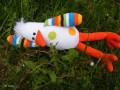 Háčkovaný tučniak Oli v bielej farbe s farebnými krídlami, vyrástol do výšky cca 35 cm, materiál 100% bavlna, čierne bezpečnostné oči, vyplnený polyesterovým vláknom.