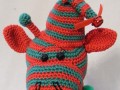 Háčkovaná prúžkovaná žirafka vo vianočných farbách doplnená malým pleteným šálikom s bambulkou a čiapočkou s červenou roľničkou. Fliačiky tvoria červené stromčeky z filcu. Očičká čierne bezpečnostné. Vyplnená polyesterovým vláknom. Materiál 100% bavlna.