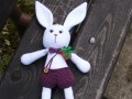 Háčkovaný zajačík s mrkvičkou vo fialových gaťkách, zdobených gombíkom. Materiál 100% bavlna, bezpečnostné oči a vyplnený polyesterovým vláknom. Vyrástol do výšky cca 32 cm. Dĺžka uší cca 11 cm