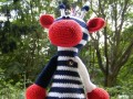 Háčkovaná žirafka v kombinácii tmavomodrej, bielej a červenej, doplnená gombíkom s kotvičkou. Očičká sú z čiernych korálkov. Použitý materiál je 100% bavlna, vyplnená polyesterovým vláknom.Žirafka vyrástla do výšky cca 40 cm.