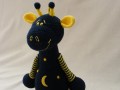Háčkovaná tmavomodrá žirafka v kombinácii so slniečkovou žltou, očká vyšívané žlté, výška cca 40 cm, vyplnená polyesterovým vláknom. Telíčko jej zdobia malé hviezdičky s mesiačikom na brušku z textilného papiera. (materiál podobný filcu)