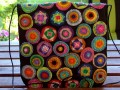Kabelka je zcela unikátní, je ušita z 1 kusu podkladového filce v černé barvě, na kterém jsou ručně našity jednotlivé segmenty - 76ks - kolečka přibližně 3 cm v průměru, navrstvené z 3 - 4 vrstev ozdobných ke středu se zmenšujících tvarů (kruh, čtverec, květina, srdce) barevně se doplňujících a jednotlivě ručně našitých ozdobným černým stehem. Kabelka je podšita průsvitnou modrou podšívkou, přední klopa je zatížena dlouhou šňůrkou s přírodními korálky, má popruh přes rameno z krásné pevné černé porty.