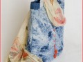 Elegantní kabelka vyrobená z žíhané džínoviny s drobnými dirkami v textuře. Na přední straně je zdobená provlečenou hedvábnou ručně barvenou šňůrkou a mačkanými korálky červené barvy. Velká je 32x28cm.