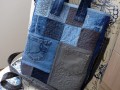 Kabelka z recy rifloviny. Na přední straně aplikace hvězda + element od původních riflí, pod nimi je velká kapsa se zapínáním na patentku. Je pevná, podlepená termolinem a pak prošívaná, dobře drží tvar. Pevné uši.