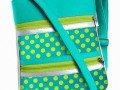 Na přední straně jsou dvě praktické, plně funkční kapsy na zip z krásné látky s motivem žlutozelených puntíků, kterou lemují tyrkysové a stříbrné pásky. Vnitřek kabelky je na zip, vypodšitý saténem a má ještě všitou kapsičku na doklady.