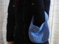 Kabelka je z lesklé světle modré příze a není podšitá. Zapíná se na dva knoflíky.