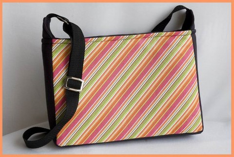 Menší kabelka ušitá z černé látky a na předním dílu z bavlněné proužkové látky Summer song - Riley Blake od Melluzinky. Podšívku má černou, dvě kapsičky uvnitř s oranžovým lemováním. Je vyztužena ronopastem. Ucho je z černého popruhu širokého 2,5cm a nastavitelnou délkou. Rozměry: výška - 20cm, šířka dole 28,5cm, šířka nahoře 26,5cm, hloubka 6,5cm.