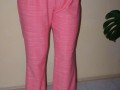 Kalhoty jsou ušity z nepružné, ale splývavé kostýmové látky lososové barvy. V pase jsou do 2,5cm široké gumy a v tunýlku mají tkaničku, takže si je pohodlně přizpůsobíte své postavě. Švy jsou prošity nití v bílé barvě a začištěny overlockem(entlem). Modelka je konfekční velikosti 46 a vysoká je 185cm.