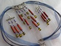 Jednoduchá ketlovaná souprava náhrdelníku a náušnic je zhotovena z kovových komponentů, skleněných a dřevěných korálků, modré šňůrky s organzovou stužkou se zapínáním. Je příjemně lehká, elegantní i výrazná zároveň. Délka přívěsku je 8,5cm včetně závěsného komponentu. Náušnice jsou dlouhé 6,9cm včetně háčku.