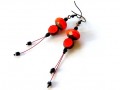 Jemná soupravička z ploškovaných korálků na lanku laděná do červena. Doplněno černými ohňovkami. Skládá se z náhrdelníku, náramku a naušniček.