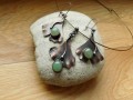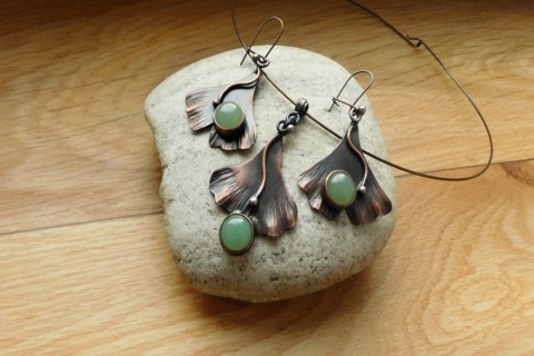 K tomu měděný přívěsek jinanu dvoulaločného , uvnitř je tské zelený avanturin, vel 10 mm. Výška přívěsku je 4 cm, šíře 3,1 cm.Zavěšeno na patinované nerezové obruči ,možno vyměnit za kulatou černou kůži s měděným uzávěrem.Nebo za měděný řetízek.