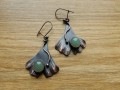 Měděné naušnice s krásným zeleným avanturinem, vel. 10 mm. Délka naušnic je 3,4 cm, šířka v nejšiřší části 2,8 cm.