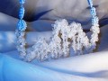 Byl použit drát, na kterém jsou zlomky křišťálu a na silonech blankytně modré, broušené korálky, jako obloha.