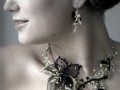 Souprava náhrdelník a náušnice z ručně paličkované krajky. Barva zlato-černá. Pokovené a viskózové příze, jemný drátek, skleněné korálky a perličky. Ústřední květ je složen z tylových černých lístků ručně obpaličkovaných krajkou. Zapínání na karabinku a posuvný řetízek. Náušnice háček. Souprava je určena na slavnostní příležitosti.