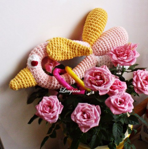 Vlastní návod na háčkovaného ptáčka s chrastítkem, kousátkem a klipsem, který je podrobně rozepsaný, doplňěný fotografiemi. Posílám e-mailem v PDF formátu.
