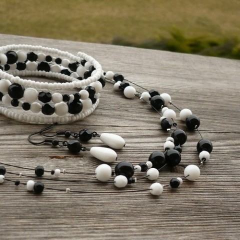 Náhrdelník je tvořený z tří řad bižuterního lanka černé barvy, na kterém jsou v nepravidelných odstupech od sebe navlečeny různě velké bílé a černé skleněné korálky. Obvod náhrdelníku je 42,5 cm.