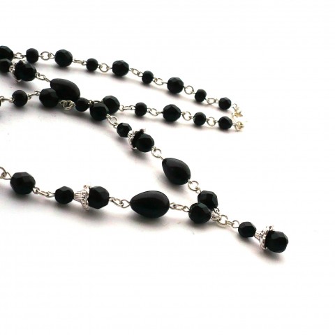 Celokorálkový náhrdelník z černých skleněných korálků dozdobený na několika místech ozdobnými bižuterními komponenty stříbrné barvy.