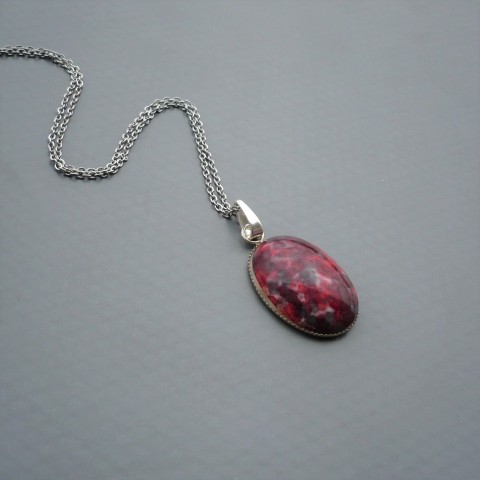 Oválný přívěsek s červeným mourovaným skleněným kamínkem je umístěný na řetízku z nerezové oceli.