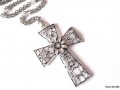 Dlouhý řetízek s přívěskem - velký filigránový kříž s kamínky 8,5 x 5,5cm v platinové barvě - starostříbná, řetízek 75cm s bílými korálky s AB efektem