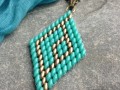Šitý přívěsek z tyrkysového a zlatého superdua - twinů ve tvaru kosočtverce. Celková délka přívěsku 7,5 cm, šířka 3,5 cm. Mosazný řetízek - běžný kov, délka 46 cm, zapínání karabinka. Délku řetízku můžu na přání upravit